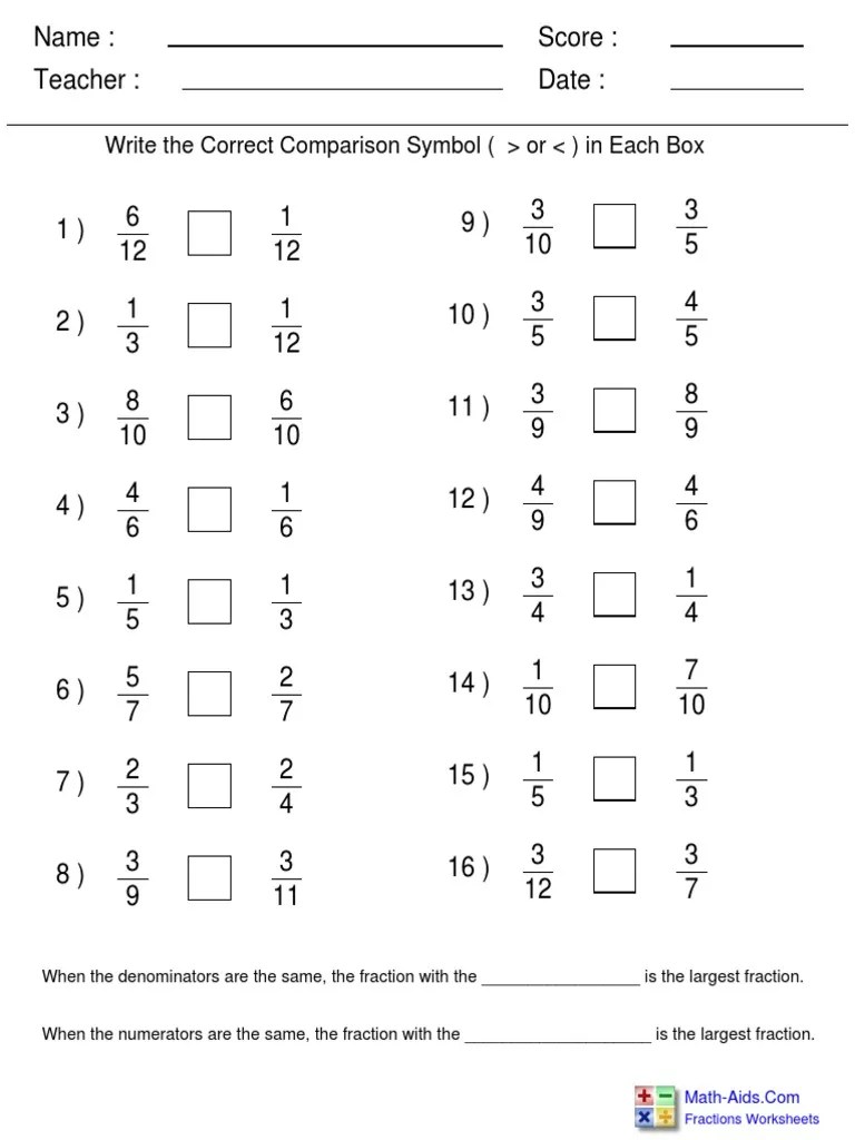 Math Aids Fractions Worksheets : Greater Than Or Less Than Comparing Fractions Worksheets 99worksheets -